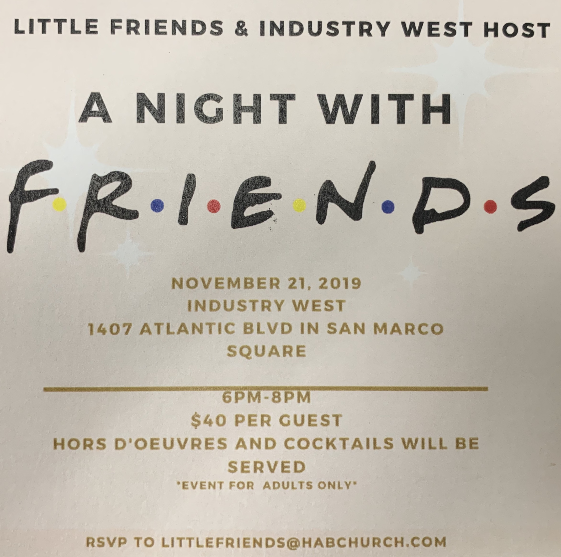 All are welcome to our first annual “Night with Friends” event at Industry West on Thursday, November 21, from 6:00-8:00 p.m. You can meet our teachers and our fantastic families. If you would like to attend, please contact me at littlefriends@habchurch.com. We would love to see you there!