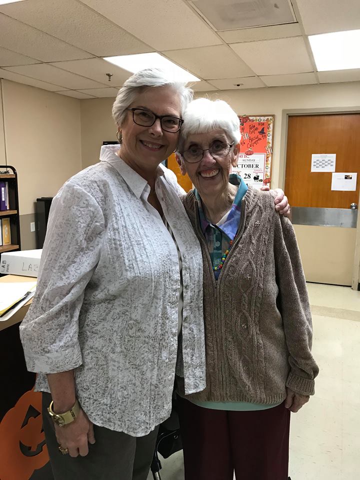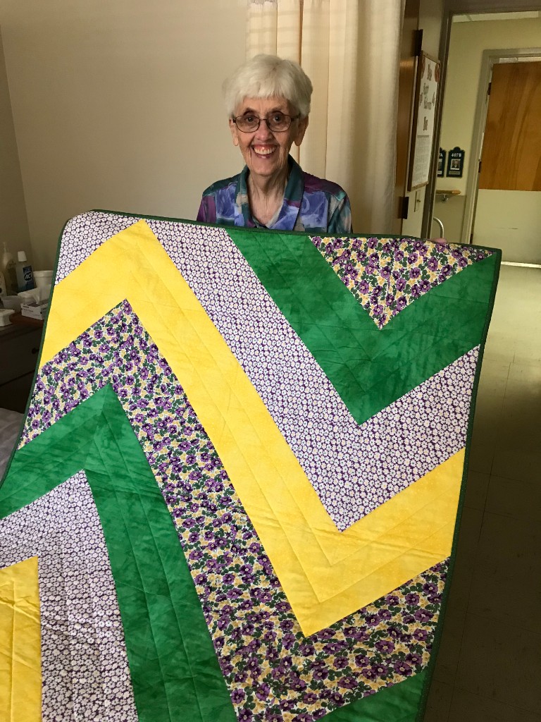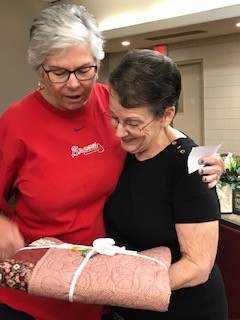Prayer Shawl Ministry member Debbie Hagan shares a prayer quilt with HAB member Virginia Holland.