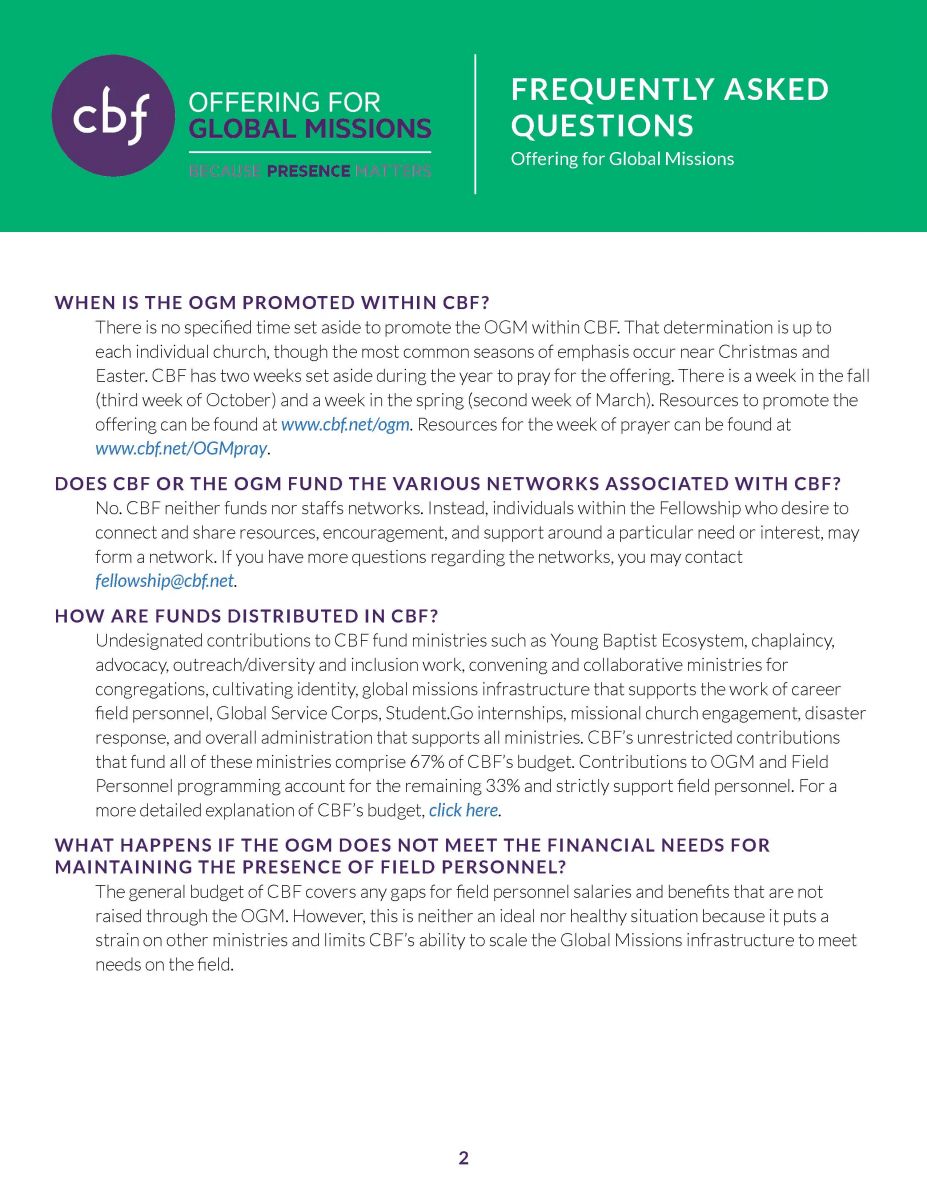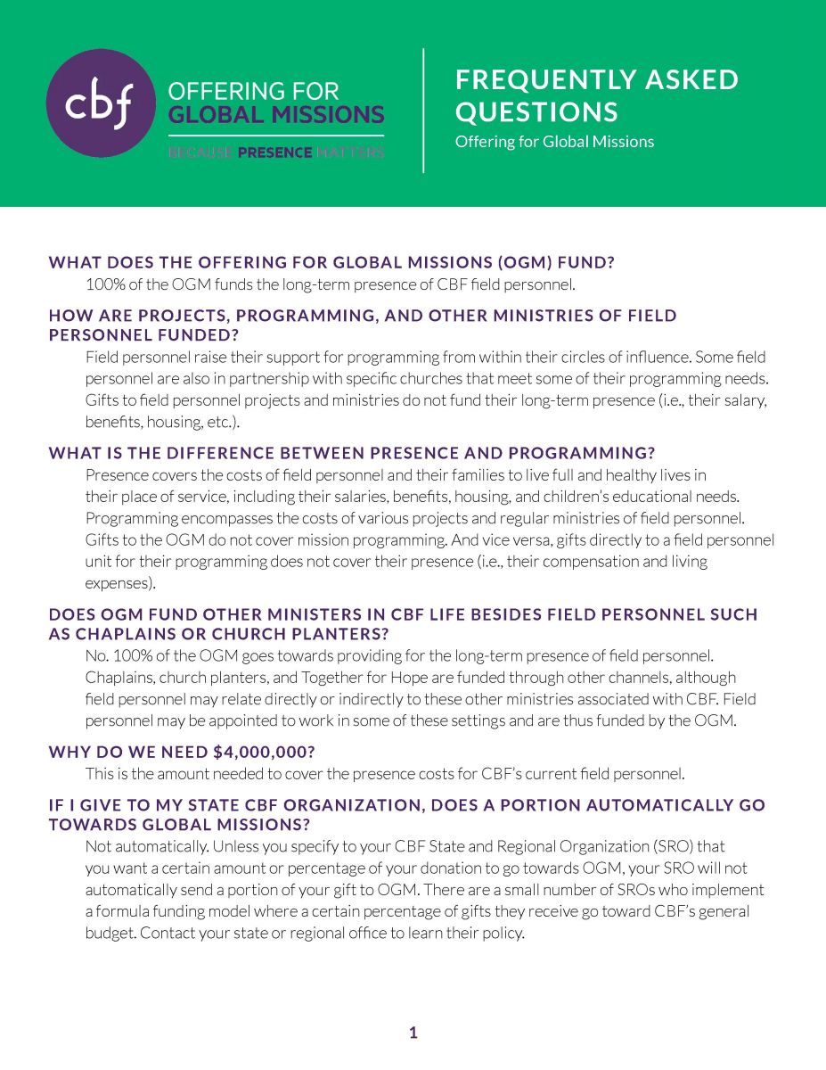 During December, we look at all the wonderful work that the Cooperative Baptist Fellowship (CBF) does around the world. When you give to the Offering for Global Missions (OGM), you are supporting the long-term presence of field personnel in 19 countries as they cultivate beloved community, bear witness to Jesus Christ and seek transformational development among people and places otherwise forgotten and forsaken by the world. As you prayerfully consider giving to the OGM, take some time to view these videos that highlight their three areas of focus: Global Poverty, Global Migration, and Global Church. If you look would like to learn more about the Offering for Global Missions, see the frequently asked questions and read testimonials from CBF field personnel below the videos.